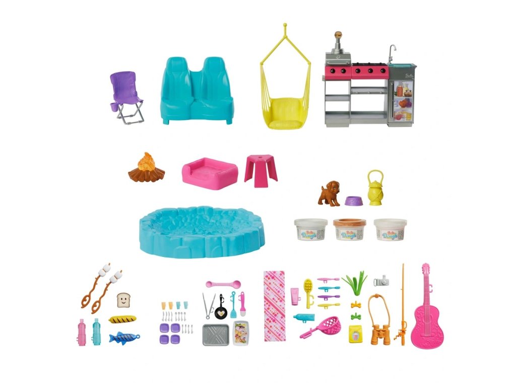 Součástí balení je také modelovací hmota, se kterou lze připravovat hamburgery a další dobroty – a díky barevnému efektu při „grilování“ se jídlo mění zpět a znovu podle toho, zda použijete teplou nebo studenou vodu. Nechybí ani ohniště s marshmallow, rybářský prut, skládací židle, kytara a mnoho kuchyňského příslušenství.