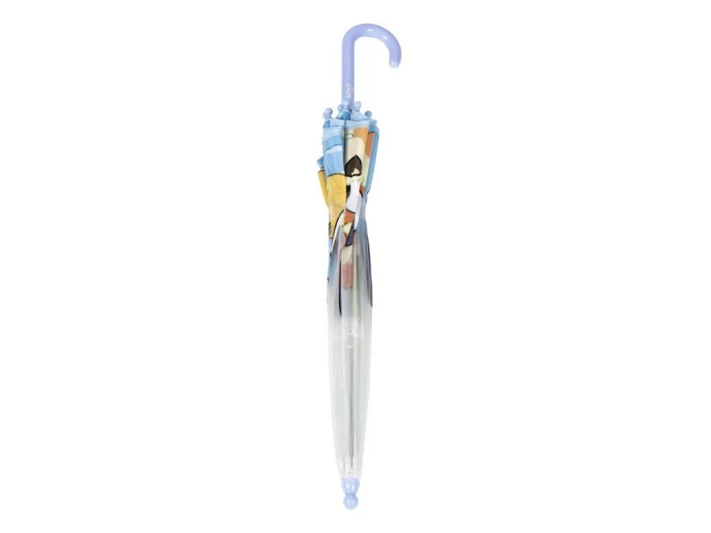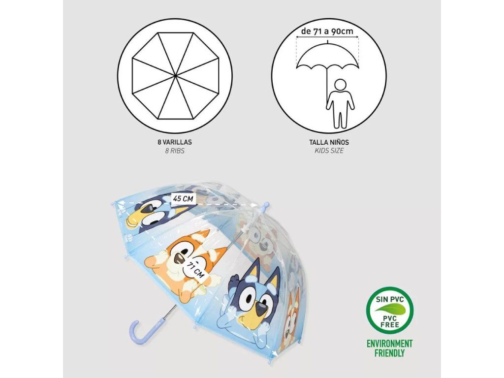 Dětský průhledný deštník Bluey od značky Cerdá je ideálním doplňkem pro malé fanoušky oblíbeného animovaného seriálu. Díky transparentnímu provedení mohou děti během deště pohodlně sledovat okolí, zatímco motiv Bluey dodává deštníku veselý a hravý vzhled. Deštník je lehký, snadno ovladatelný a přizpůsobený dětským rukám, takže se s ním dětem dobře manipuluje.