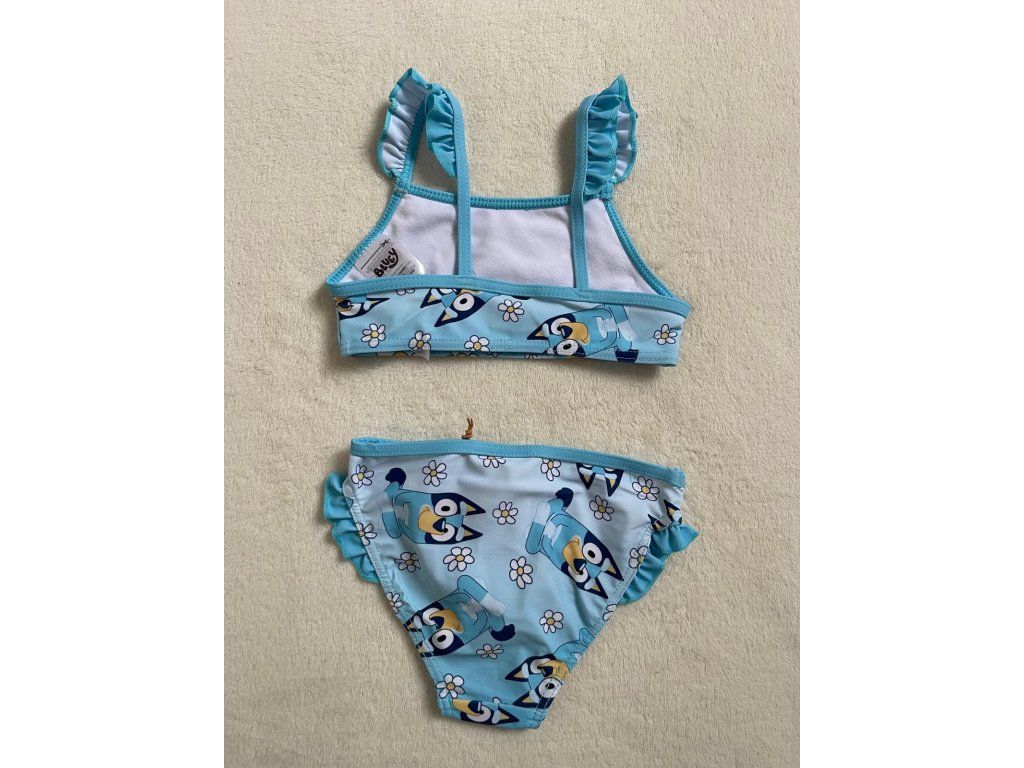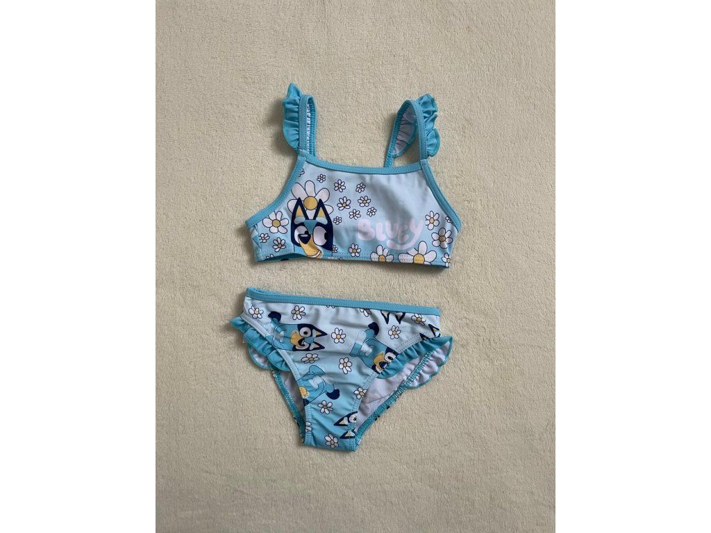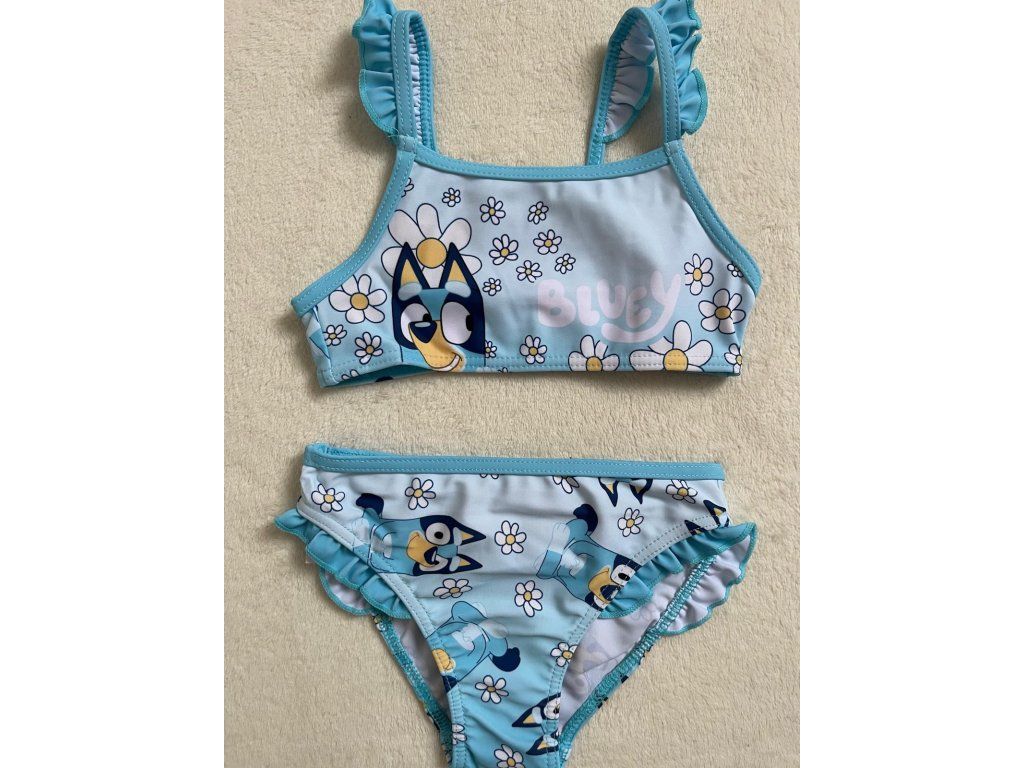 Roztomilé dětské bikiny s motivem oblíbeného seriálu Bluey potěší každou malou milovnici vody. Plavky v jemné modré barvě zdobí veselé obrázky postavičky Bluey a květinový vzor, který jim dodává hravý letní vzhled.