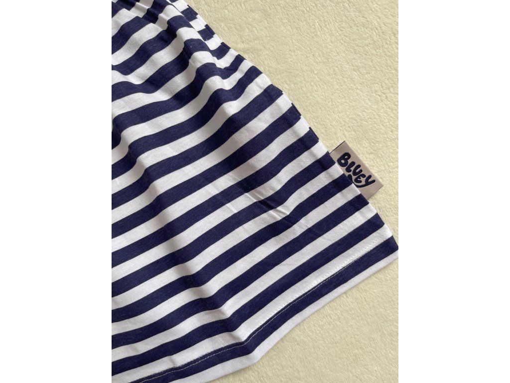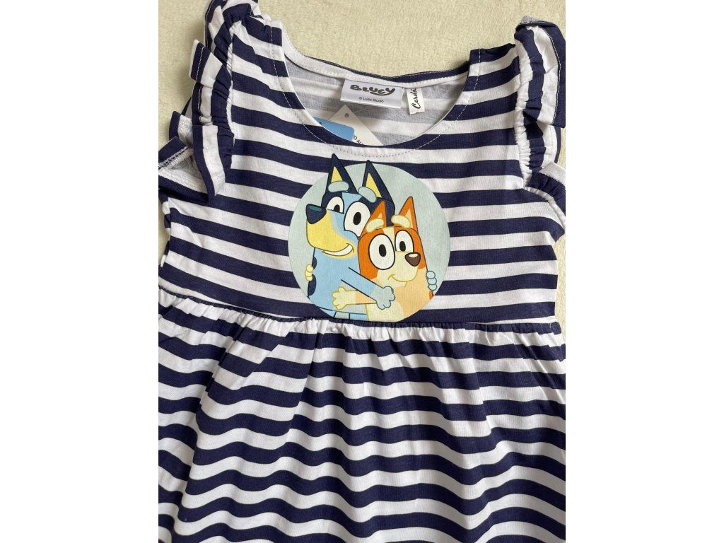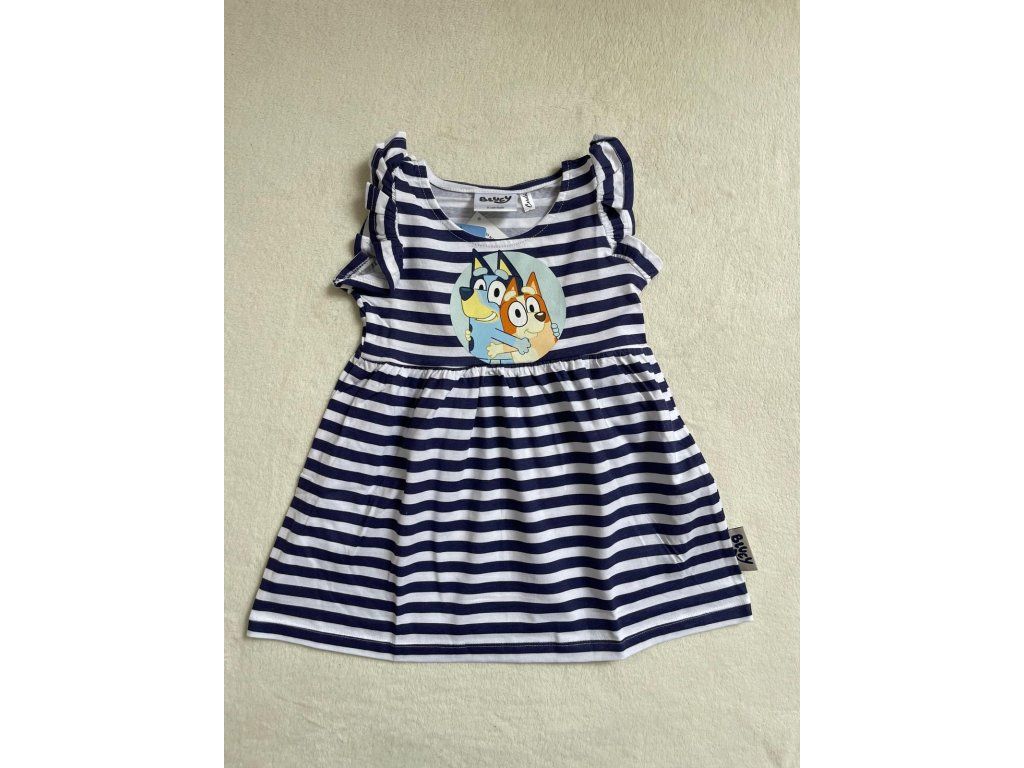 Stylové a pohodlné dívčí šaty s oblíbeným motivem pohádky Bluey, které si zamiluje každá malá fanynka. Námořnický pruhovaný design doplňuje veselý potisk hlavních postaviček na hrudi.