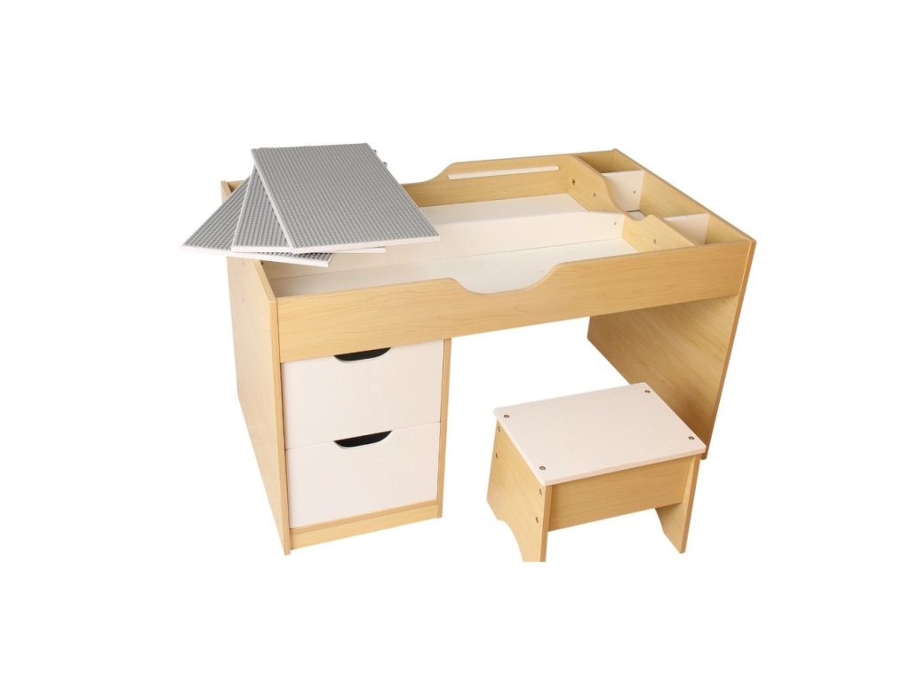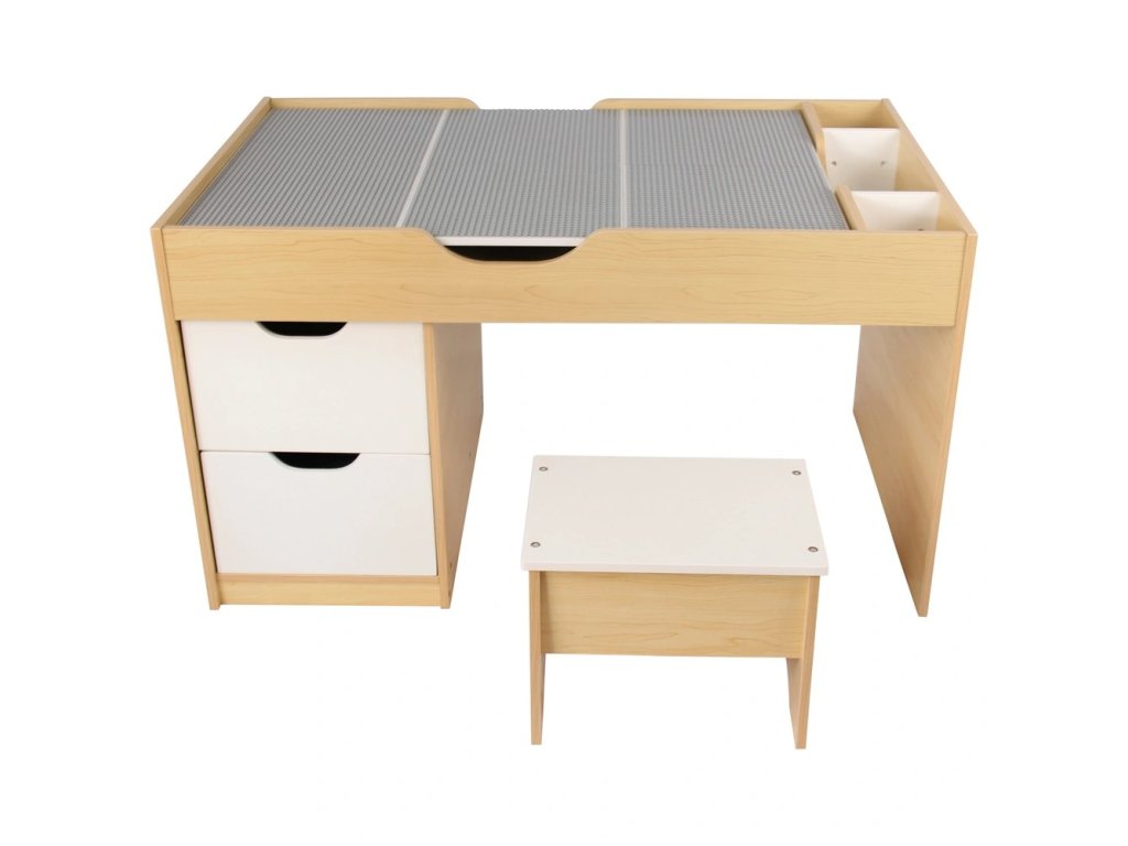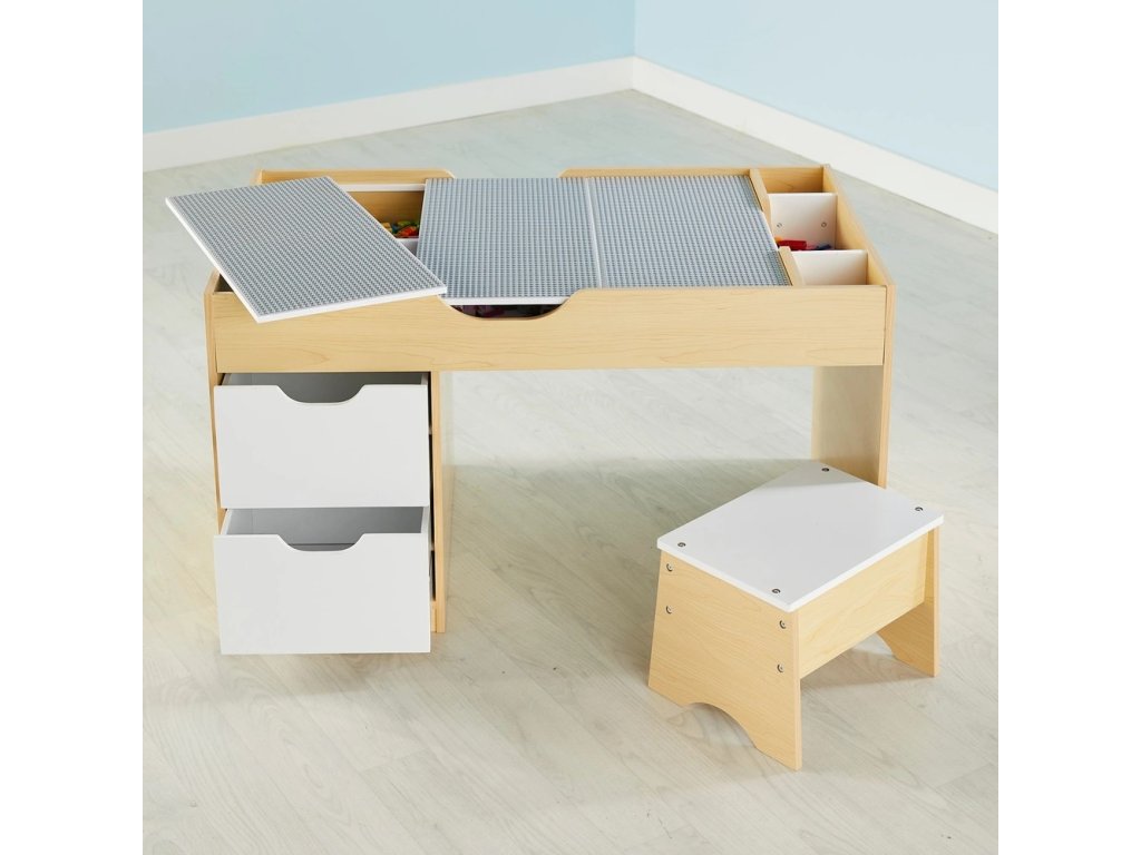 Pod deskou se ukrývají dva velké úložné prostory pro uložení kostek nebo příslušenství. V horní části stolku jsou umístěny další drobné přihrádky, a nechybí ani dvě výsuvné zásuvky, díky kterým mají děti vše potřebné doslova na dosah ruky.
