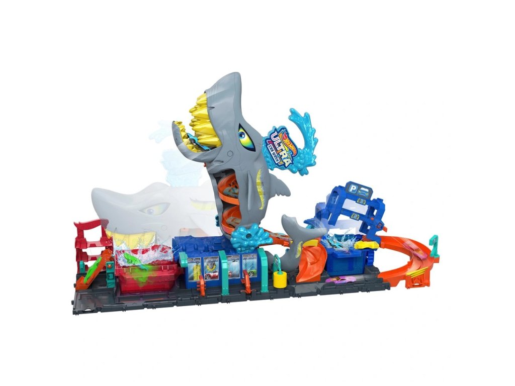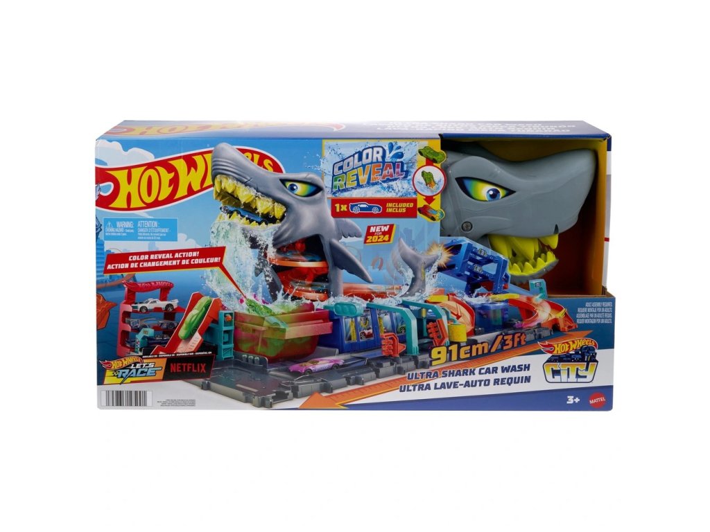 Zažij napínavou akci plnou barevných překvapení s Hot Wheels City Ultra žraločí myčkou, inspirovanou seriálem Let’s Race! z Netflixu. Pošli autíčko přímo do tlamy obřího žraloka a sleduj, jak se díky vodě mění jeho barva – znovu a znovu!