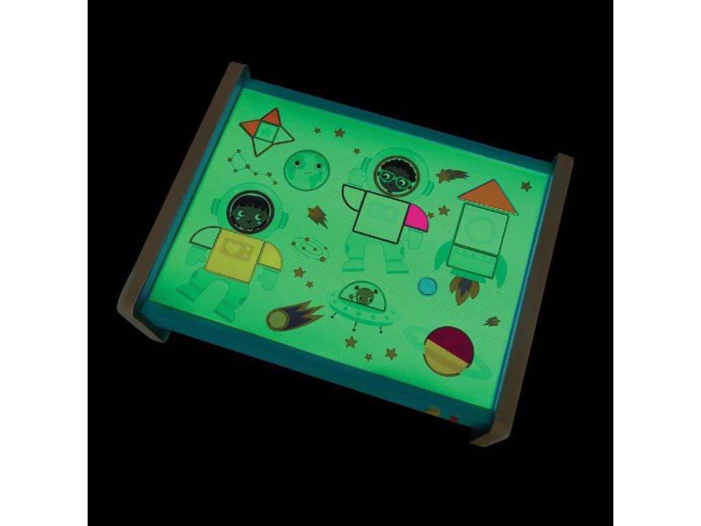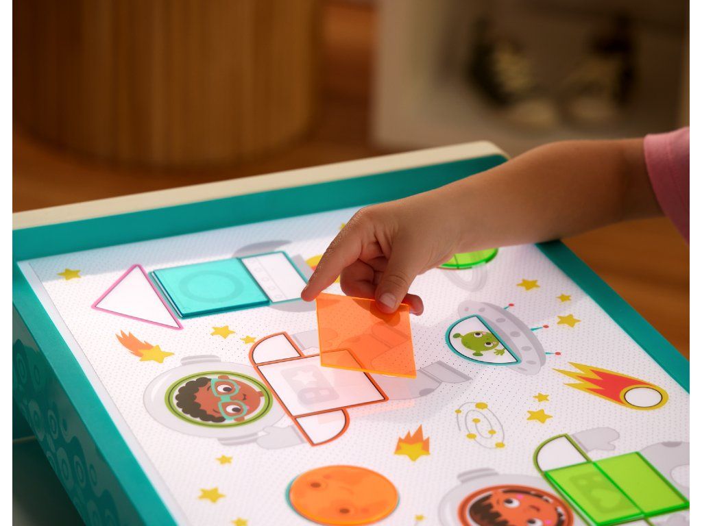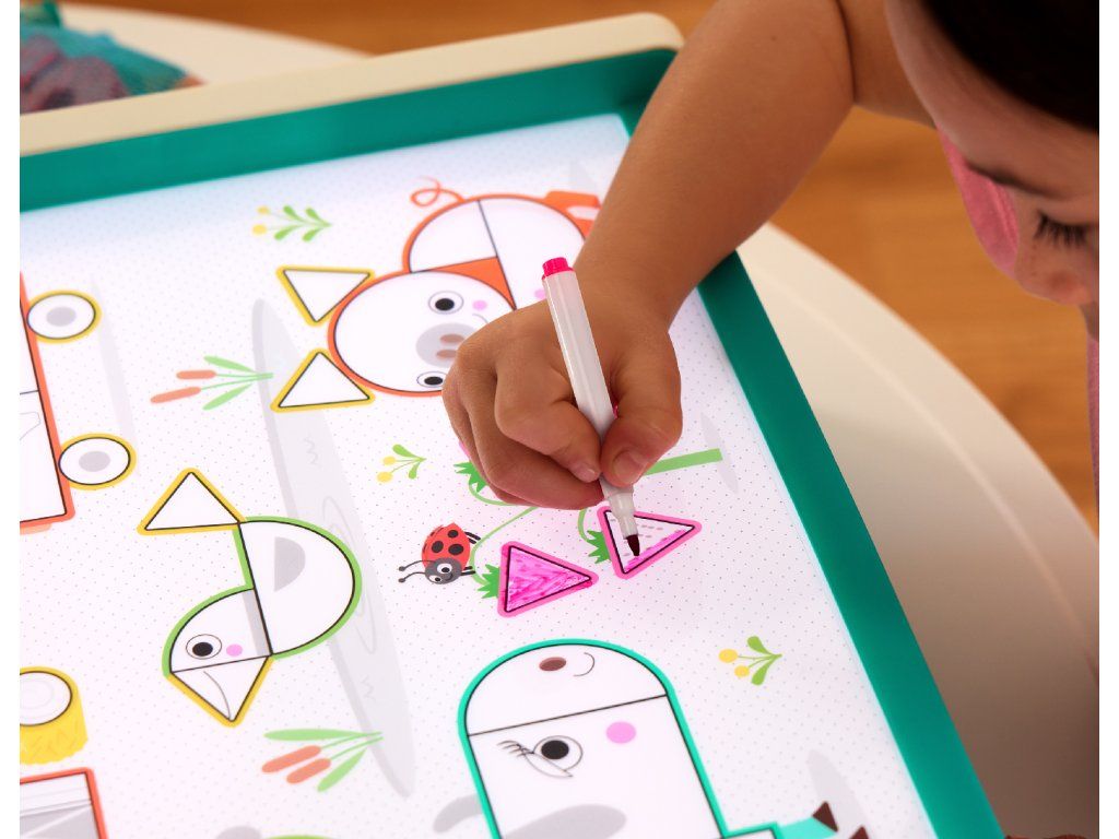 Svítící plocha pultu umožňuje měnit barvy jednoduchým stisknutím tlačítka, což dětem poskytuje ještě více podnětů ke hře a tvoření. Díky průhledným šablonám mohou děti opakovaně obkreslovat, vybarvovat a vytvářet vlastní obrázky.
