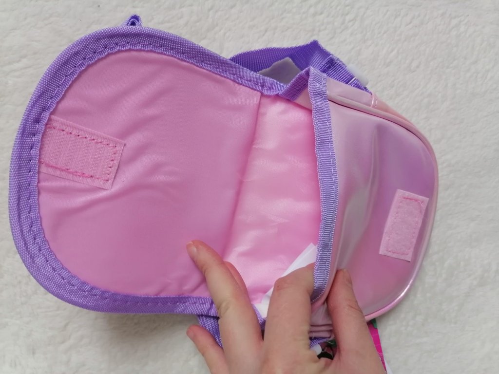 - Příjemný materiál – kombinace látky, lesklého PU a třpytek – pevné, ale lehké a bezpečné pro děti