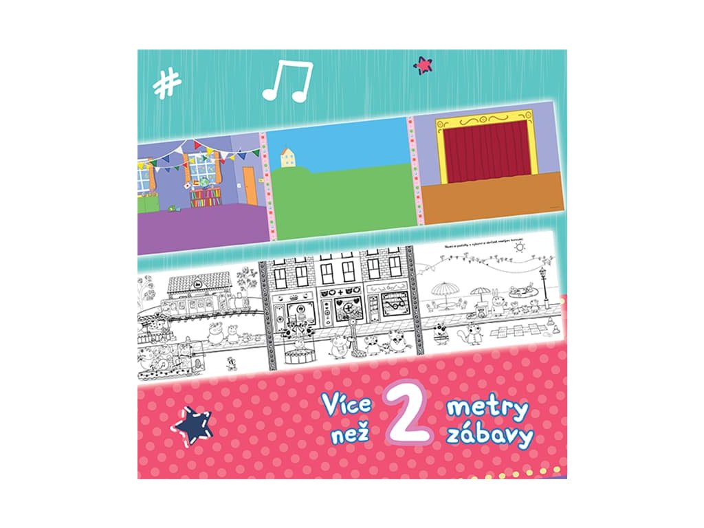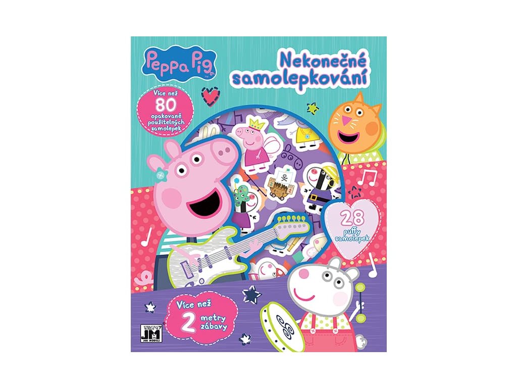 Sešit Nekonečné samolepkování: Prasátko Peppa od Jiří Models nabízí dětem zábavu na dlouhé hodiny. Obsahuje více než metr dlouhý arch, který je z jedné strany potištěný barevným pozadím určeným k dolepení samolepek a z druhé strany s omalovánkou k vybarvení.