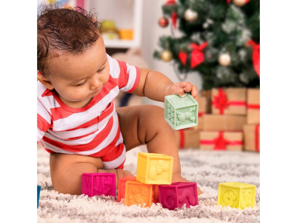 Deset barevných kostek One Two Squeeze™ od B. Toys je ideální hračkou pro nejmenší objevitele. Kostky jsou vyrobeny z měkkého plastového materiálu a při zmáčknutí pískají, což děti baví a motivuje ke hře.