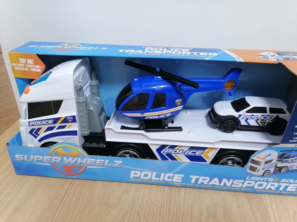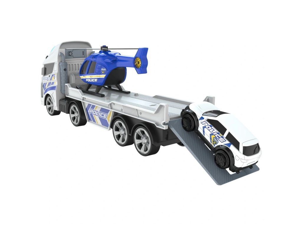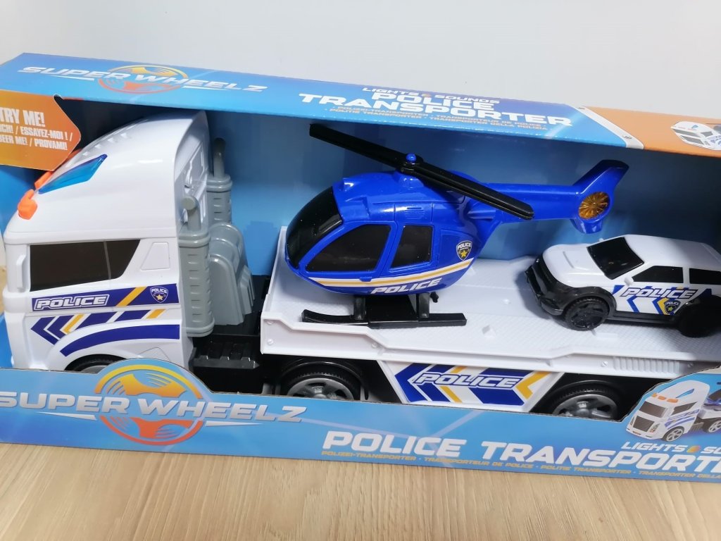 Transportér má volně pohyblivá kola, takže se snadno pohybuje po podlaze, a poskytuje prostor pro převoz policejního vrtulníku i vozidla. Vrtulník je vybaven otáčivými rotory, zatímco policejní auto lze jednoduše sjet z rampy a vyrazit do akce. Díky světelným a zvukovým efektům je hraní ještě realističtější a zábavnější.