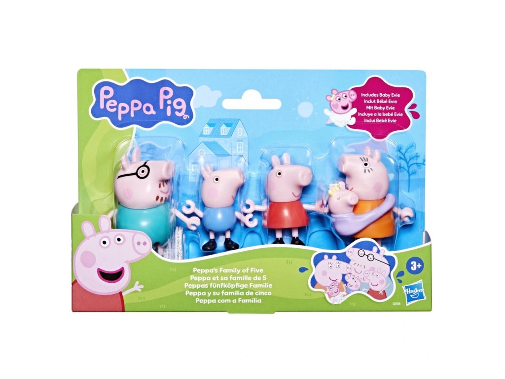 Tatínek Prasátko, Maminka Prasátko, Peppa, George a miminko Evie v nosítku -