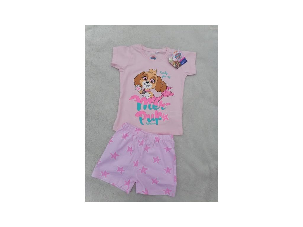 Roztomilé dívčí pyžamo s motivem oblíbené hrdinky Skye z Tlapkové patroly. Sada obsahuje tričko s krátkým rukávem a kraťásky se vzorem hvězdiček. Vyrobeno ze 100% bavlny, která je příjemná, prodyšná a zaručí pohodlný spánek i nošení během teplých nocí.