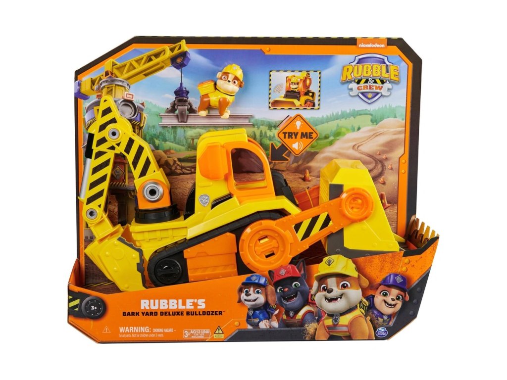 Žluto-černý XXL buldozer je vybaven blikajícími světly a realistickými zvukovými efekty, které se aktivují při jízdě. Díky pohyblivému přednímu radlici a zadní lopatě mohou děti hrnout, odklízet a stavět stejně jako v seriálu. Součástí balení je také figurka Rubble, statečná anglická buldočka, která pohodlně sedí v řidičském sedadle a je připravena na každou stavební výzvu.