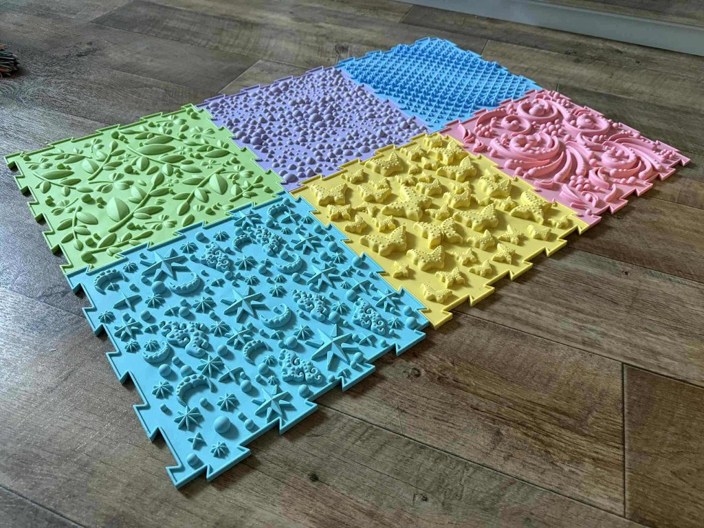 Objevte zábavnou a funkční senzorickou podložku, která podporuje rozvoj smyslového vnímání a motoriky dětí! Barevné čtvercové díly s různými texturami a reliéfy poskytují příjemnou masáž chodidel i rukou a zároveň podněcují k pohybu a hře.