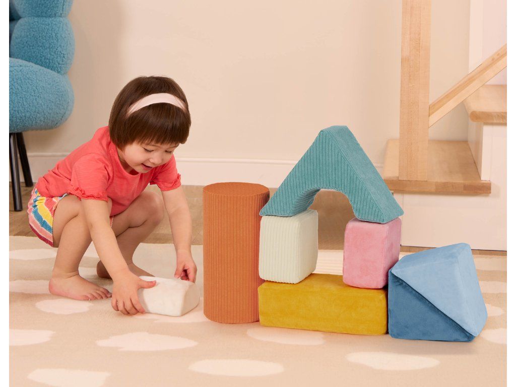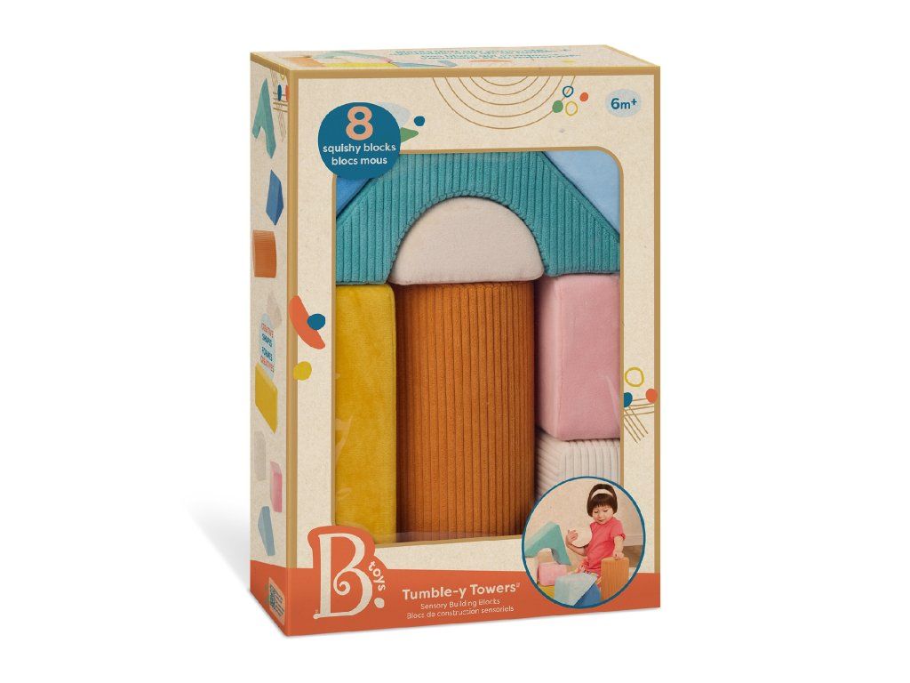 Stavět, mačkat, zkoumat a objevovat! Měkké pěnové kostky Tumble-y Towers od B. Toys jsou ideální první stavebnicí pro nejmenší děti. Sada osmi lehkých kostek v různých tvarech nabízí spoustu možností ke hře i učení.