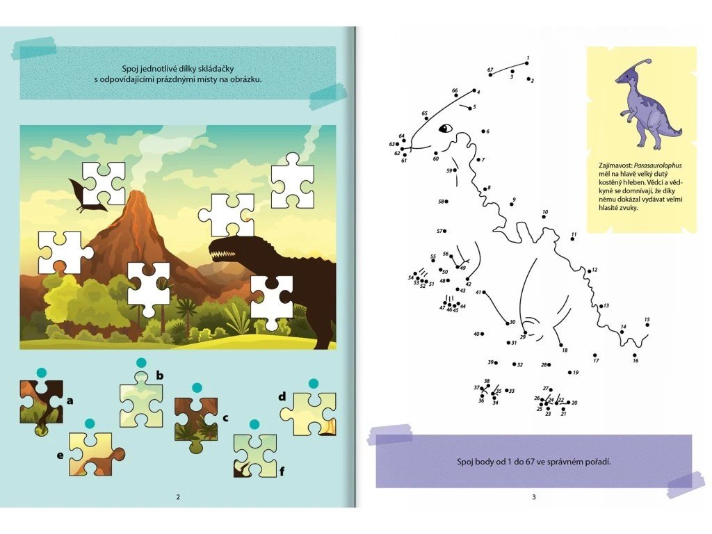 Uvnitř najdete spojování bodů s čísly, hledání rozdílů, řešení sudoku, procházení bludišť a další hravé úkoly. Při jejich řešení se děti zároveň dozví i zajímavosti o dinosaurech – například co je to zkamenělina, k čemu ankylosauři používali ocas nebo jak velké měli tyranosauři zuby.
